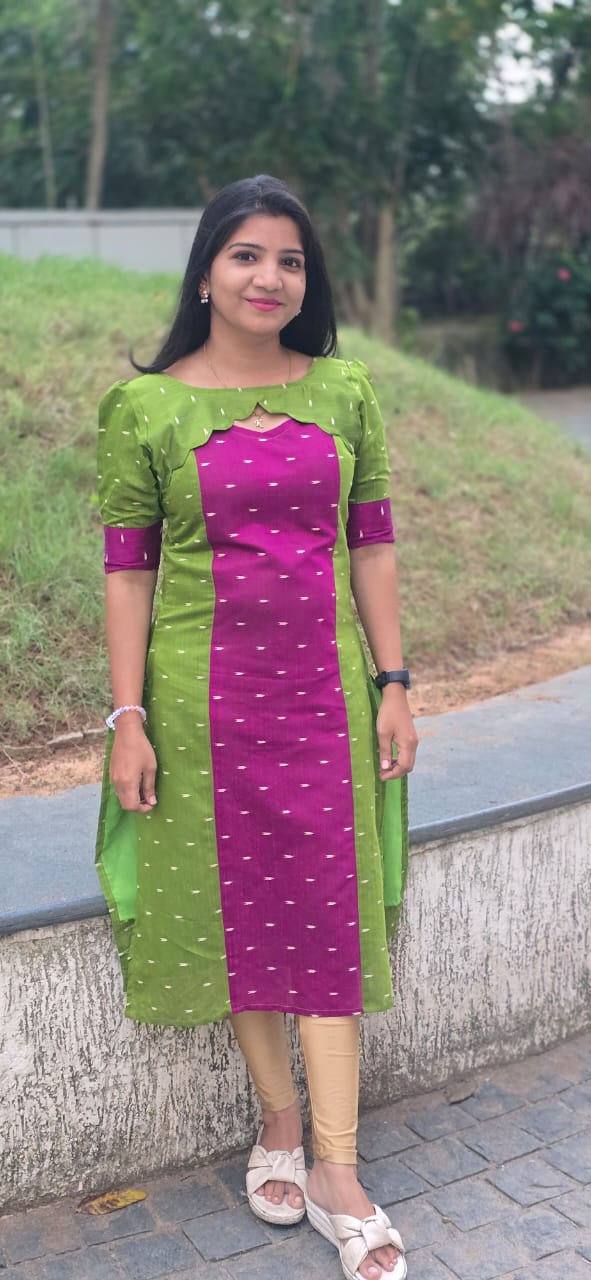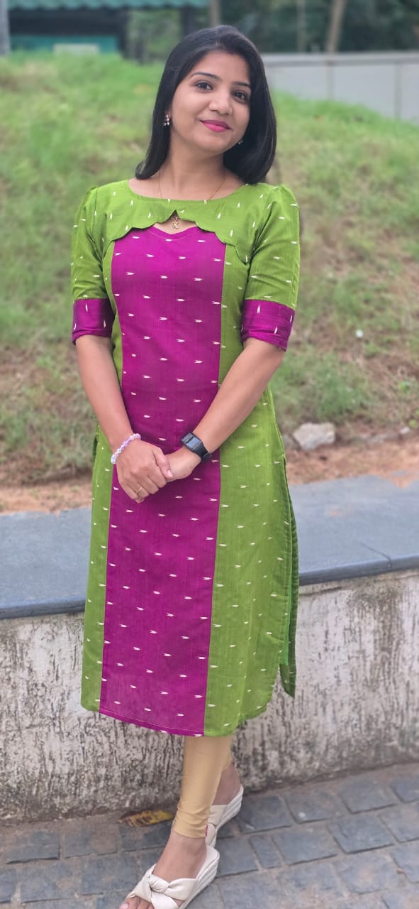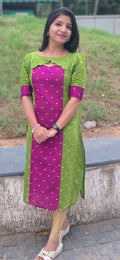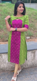 Add a touch of timeless elegance to your everyday wardrobe with this beautifully crafted straight kurti. Designed with a striking contrast of vibrant magenta and refreshing green, this kurti features subtle woven motifs that lend it a classic ethnic charm.